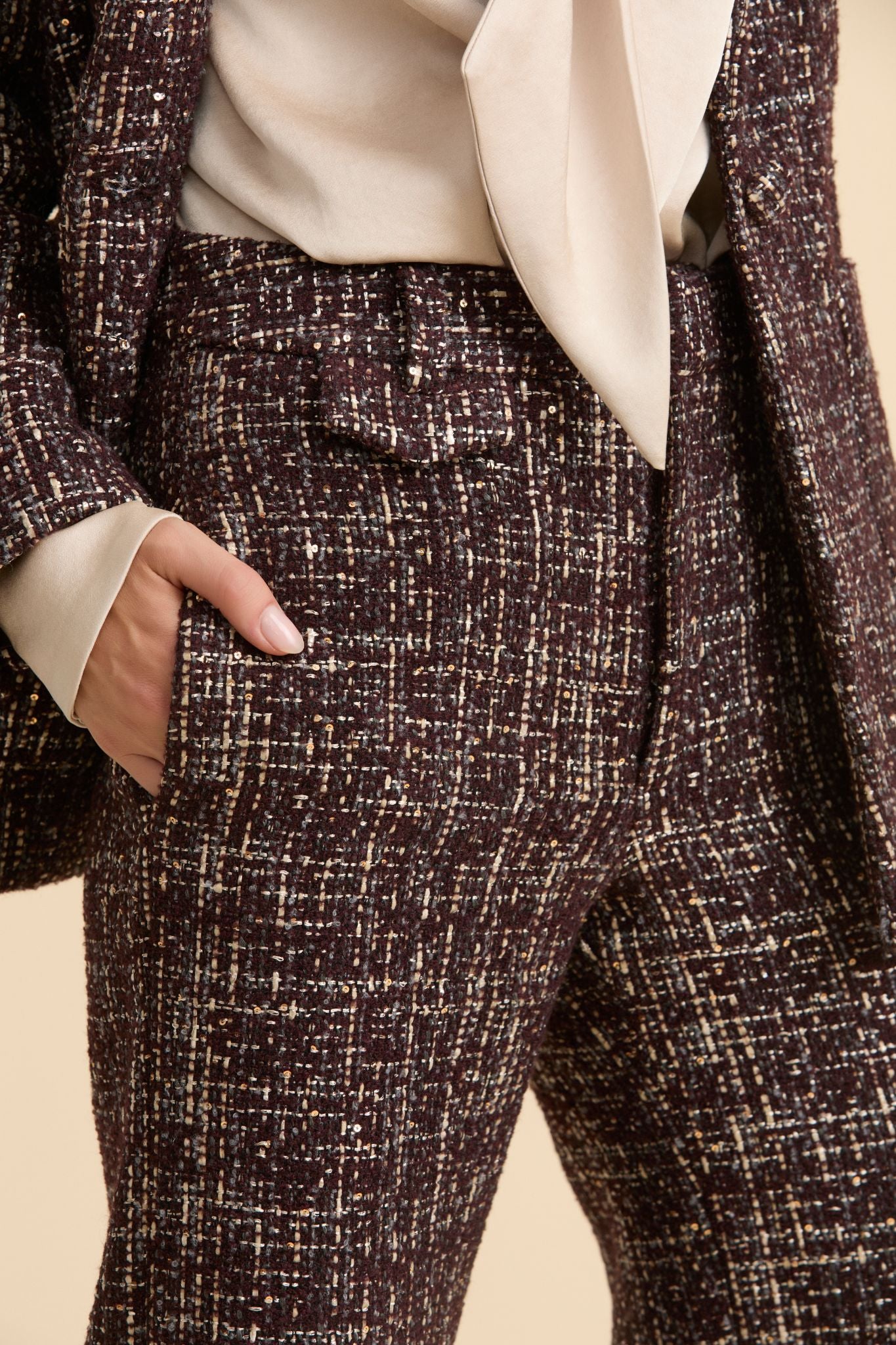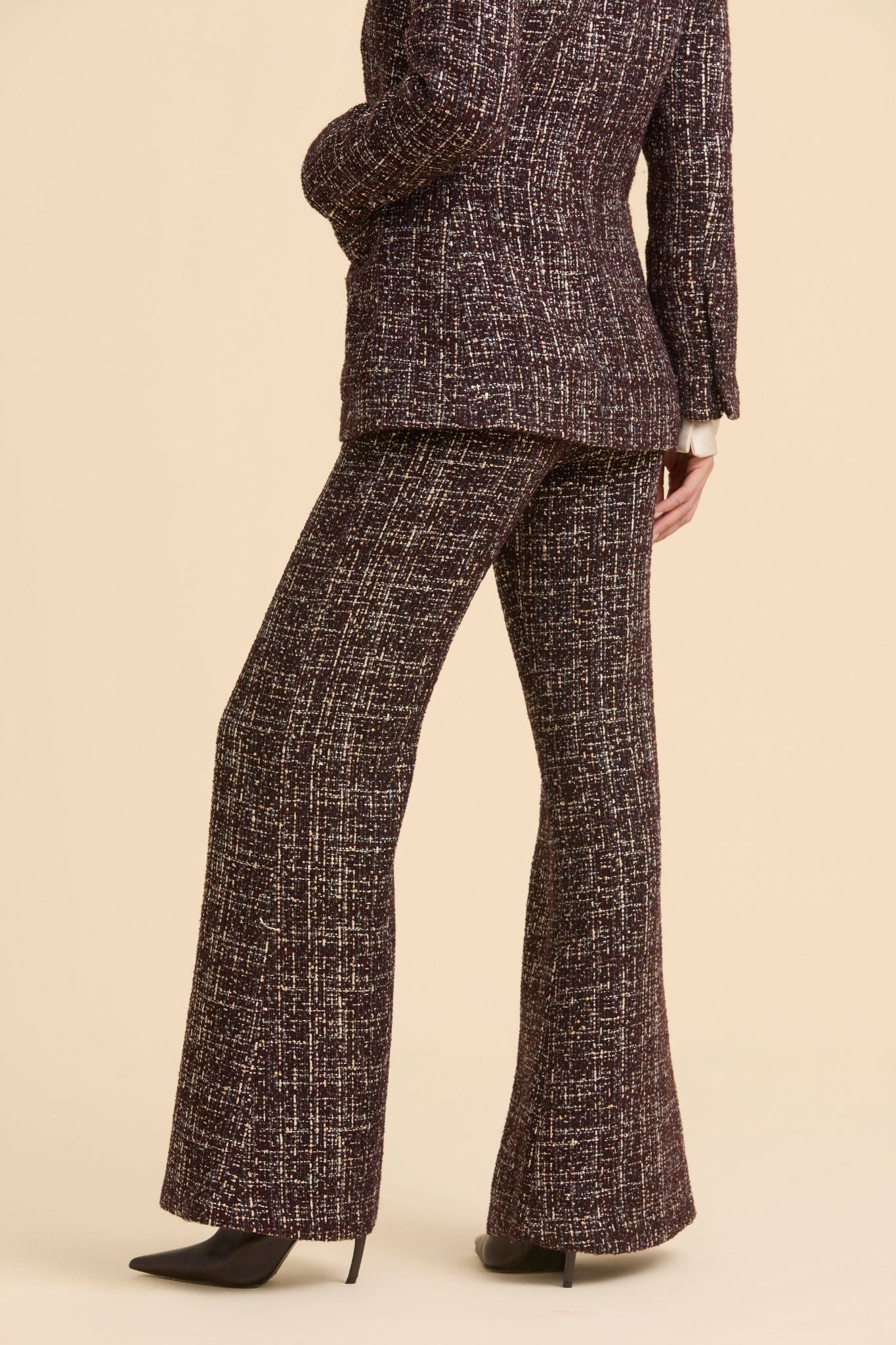 Pantalones acampanados de talle alto, confeccionados en tweed en tonos marrones con detalle de lentejuelas con minibolsillo con solapa en la cadera.