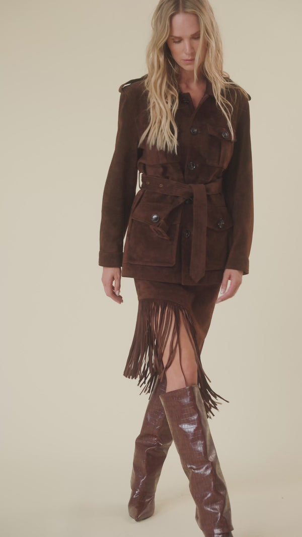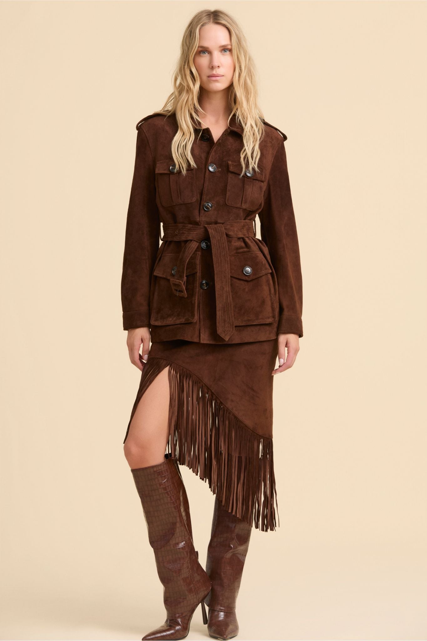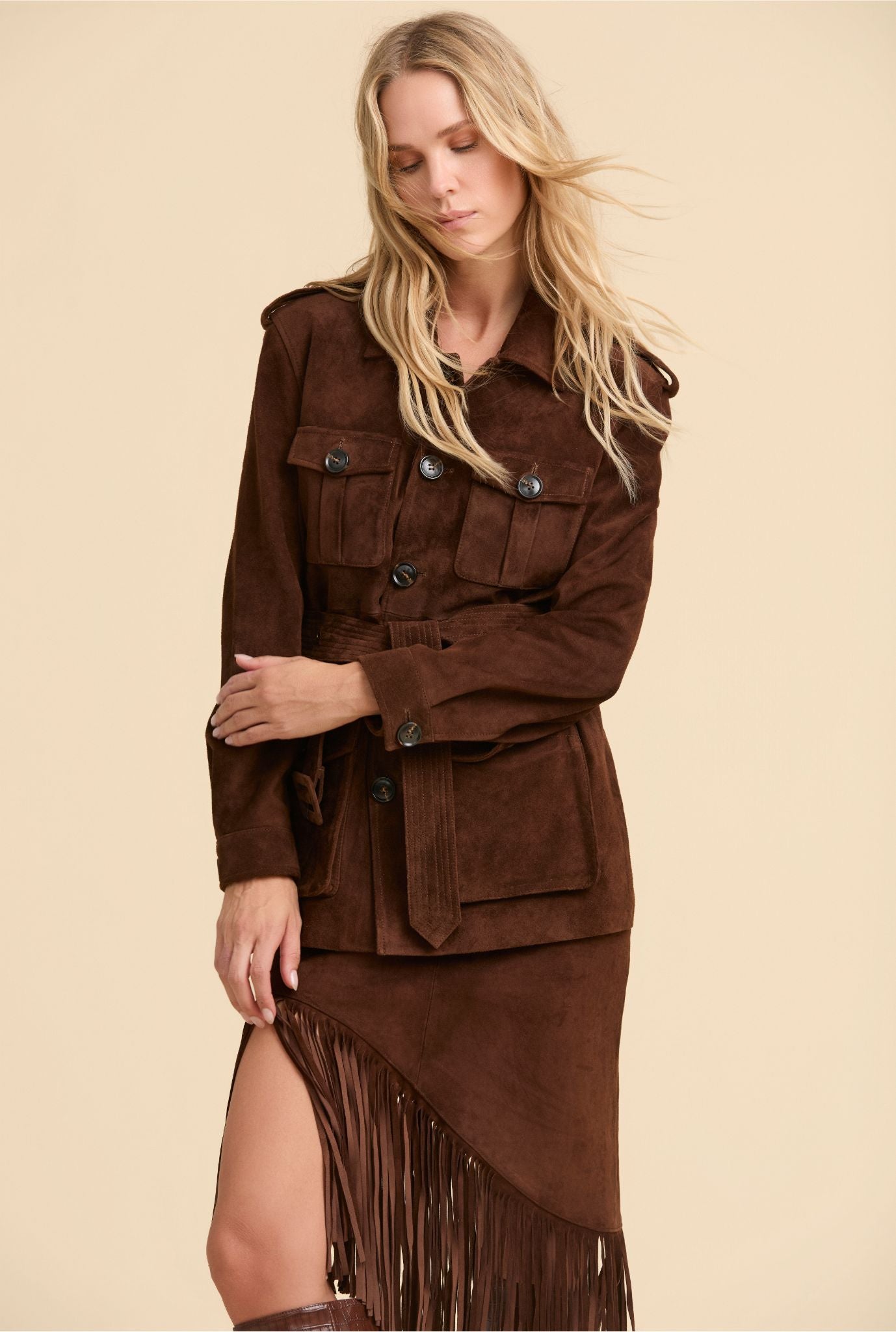 Nuestra chaqueta Dallas confeccionada en ante de alta calidad y de estilo sahariana ofrece un ajuste relajado pero sofisticado, y se completa con un cinturón a juego para definir la cintura y realzar la silueta. Los cuatro bolsillos y las líneas limpias le dan un acabado elegante, lo que la hace muy versátil. Llévala suelta para mayor comodidad o ceñida con nuestra falda Texas creando un look espectacular.