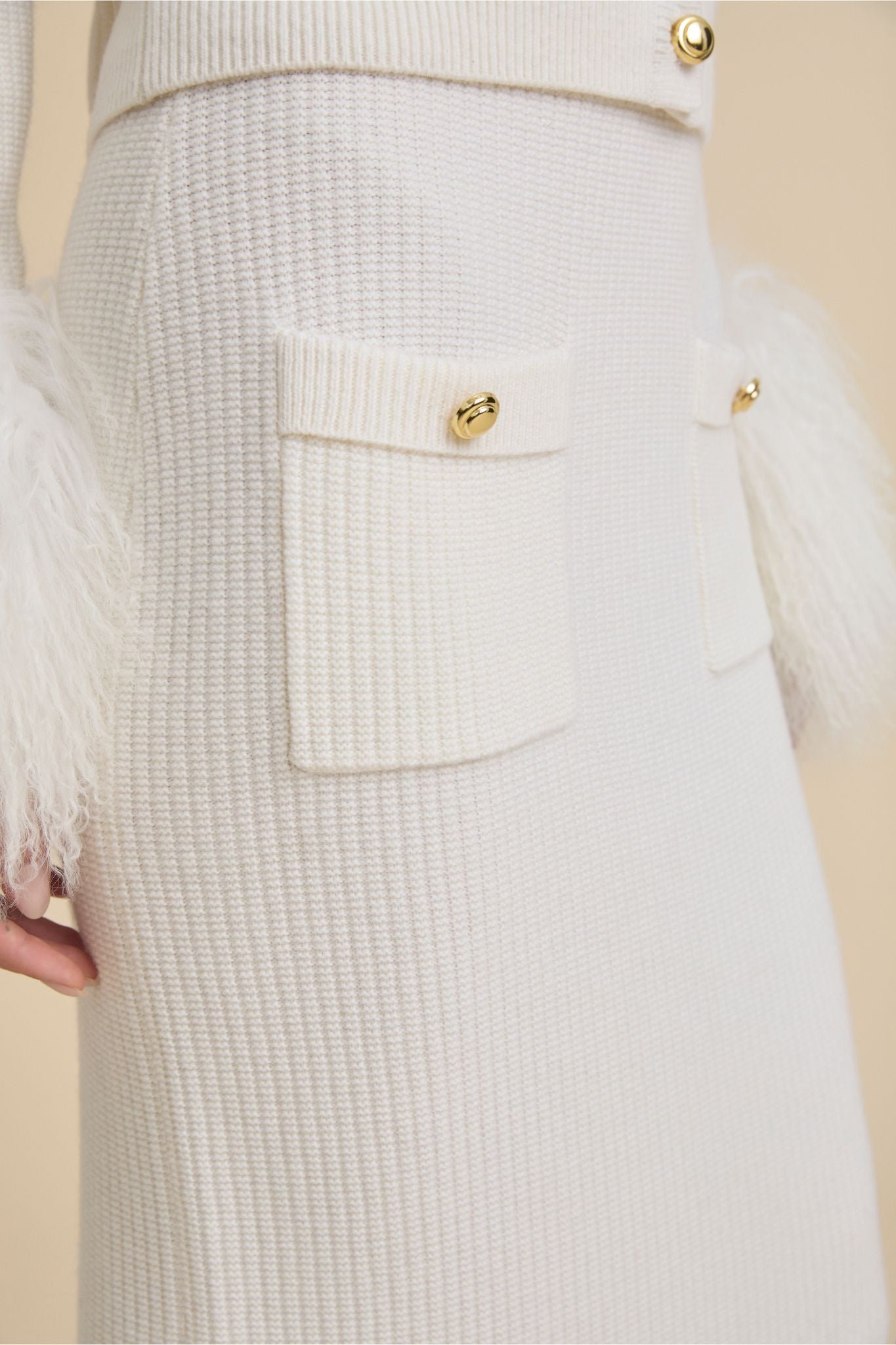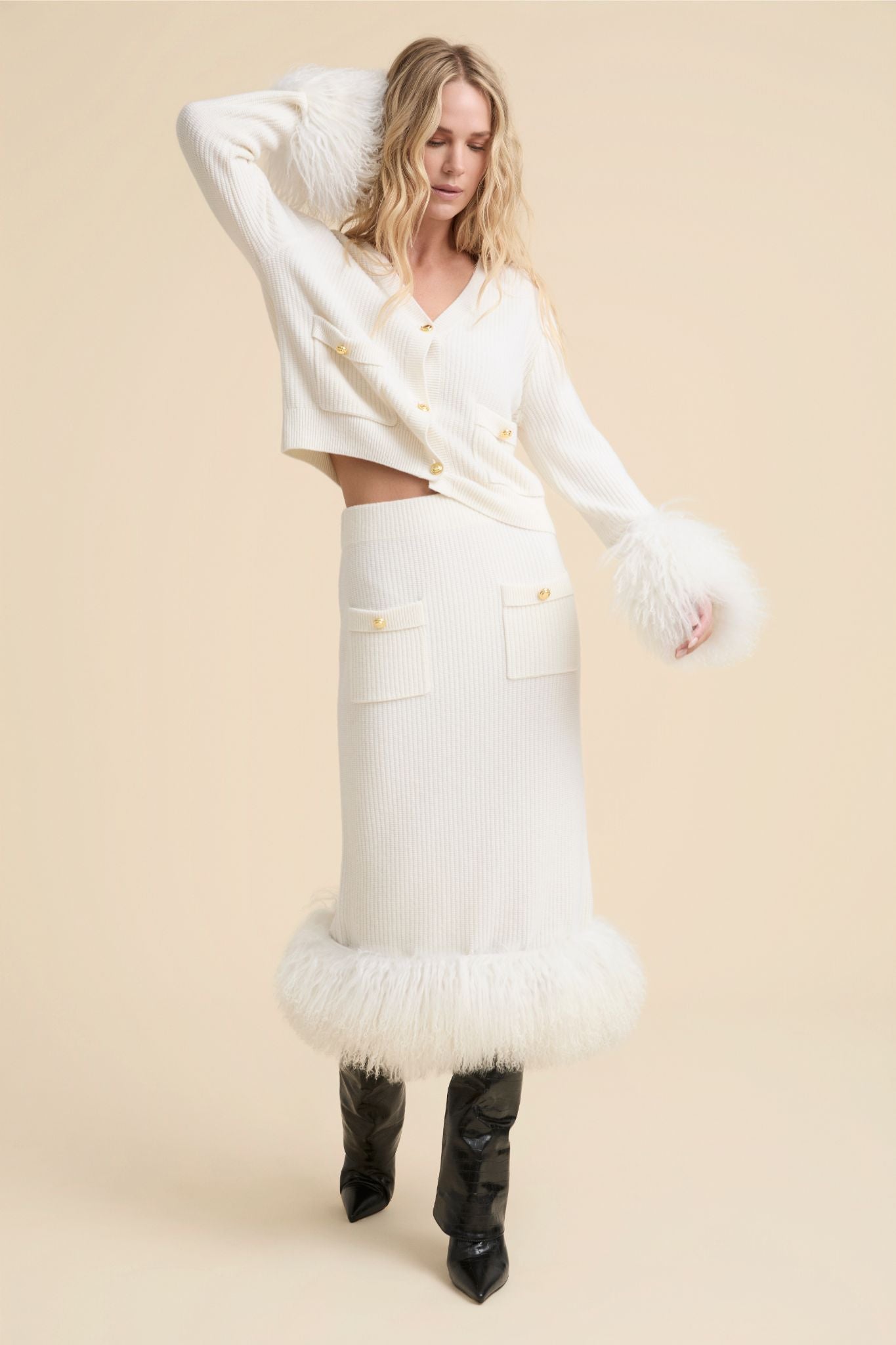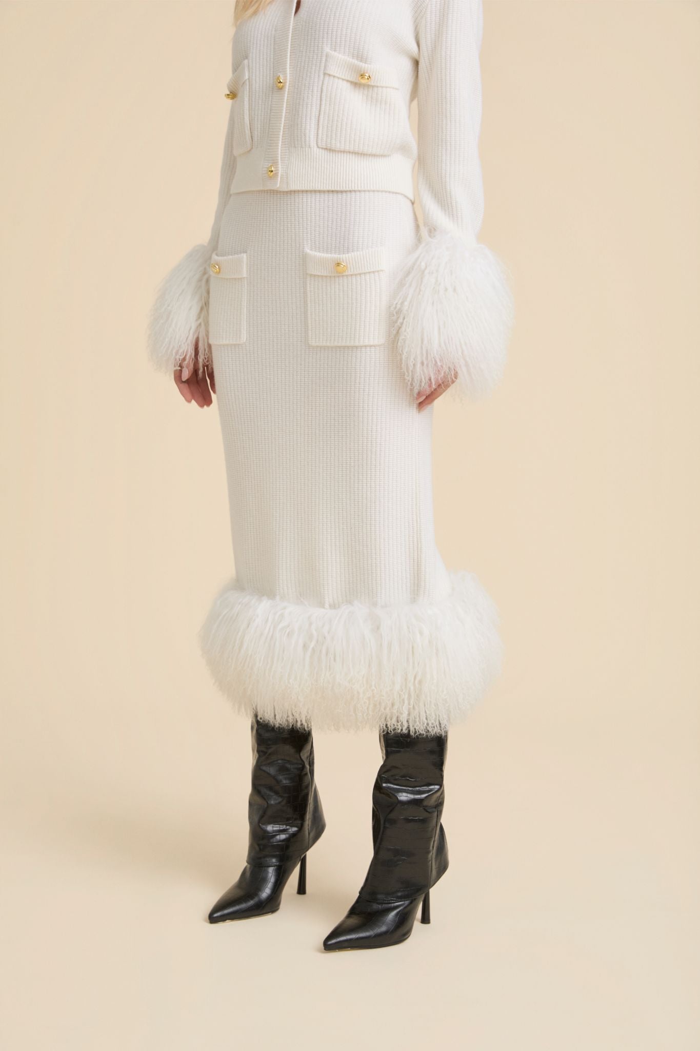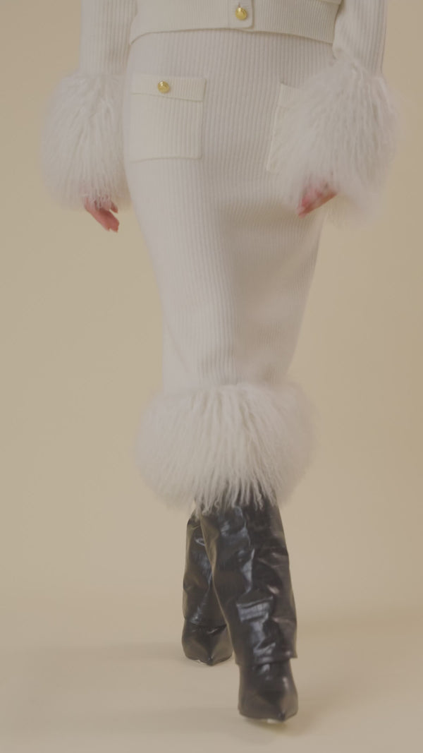 Nuestra falda Luisiana es una de las prendas estrella de la colección. De corte midi, su silueta dibuja una figura limpia y recta.El bajo es desmontable y va ribeteado con piel de oveja, que hacen que la falda no sea una prenda cualquiera, haciéndola destacar y creando una pieza original y elegante. Combínala con la chaqueta Dalila para elevar tu look y arrasar.