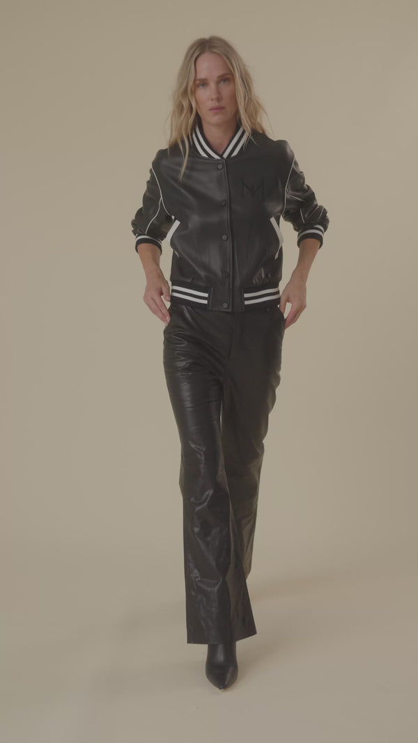 Nuestra bomber Mark, está inspirada en un  estilo universitario único y atemporal , pensada para acompañarte cada día a día, llueva o haga sol. Fabricada en suave piel de cordero y de corte boyfriend se caracteriza por su bordado en delantero y espalda con el logo de nuestra marca y por sus detalles en contraste.