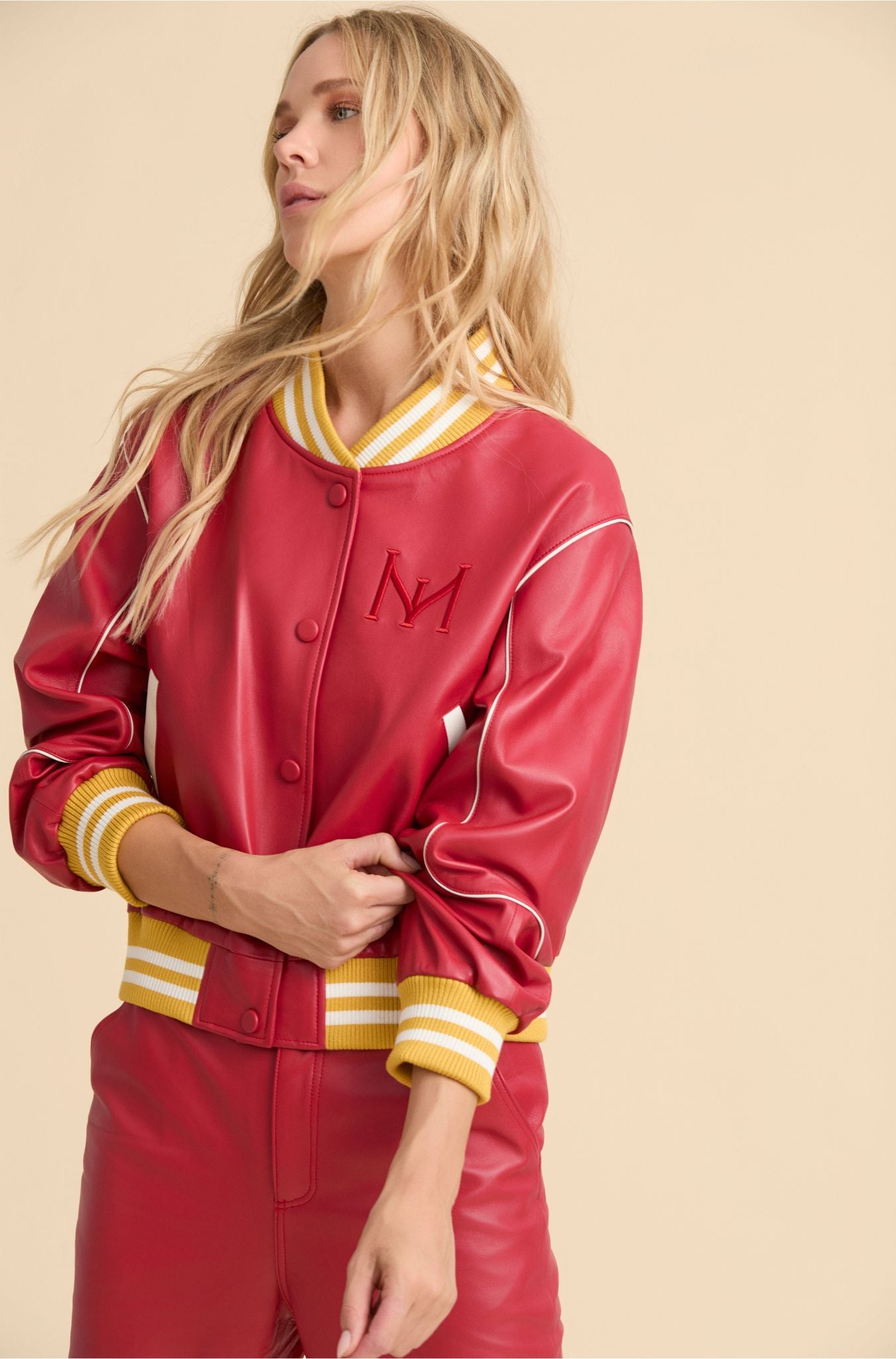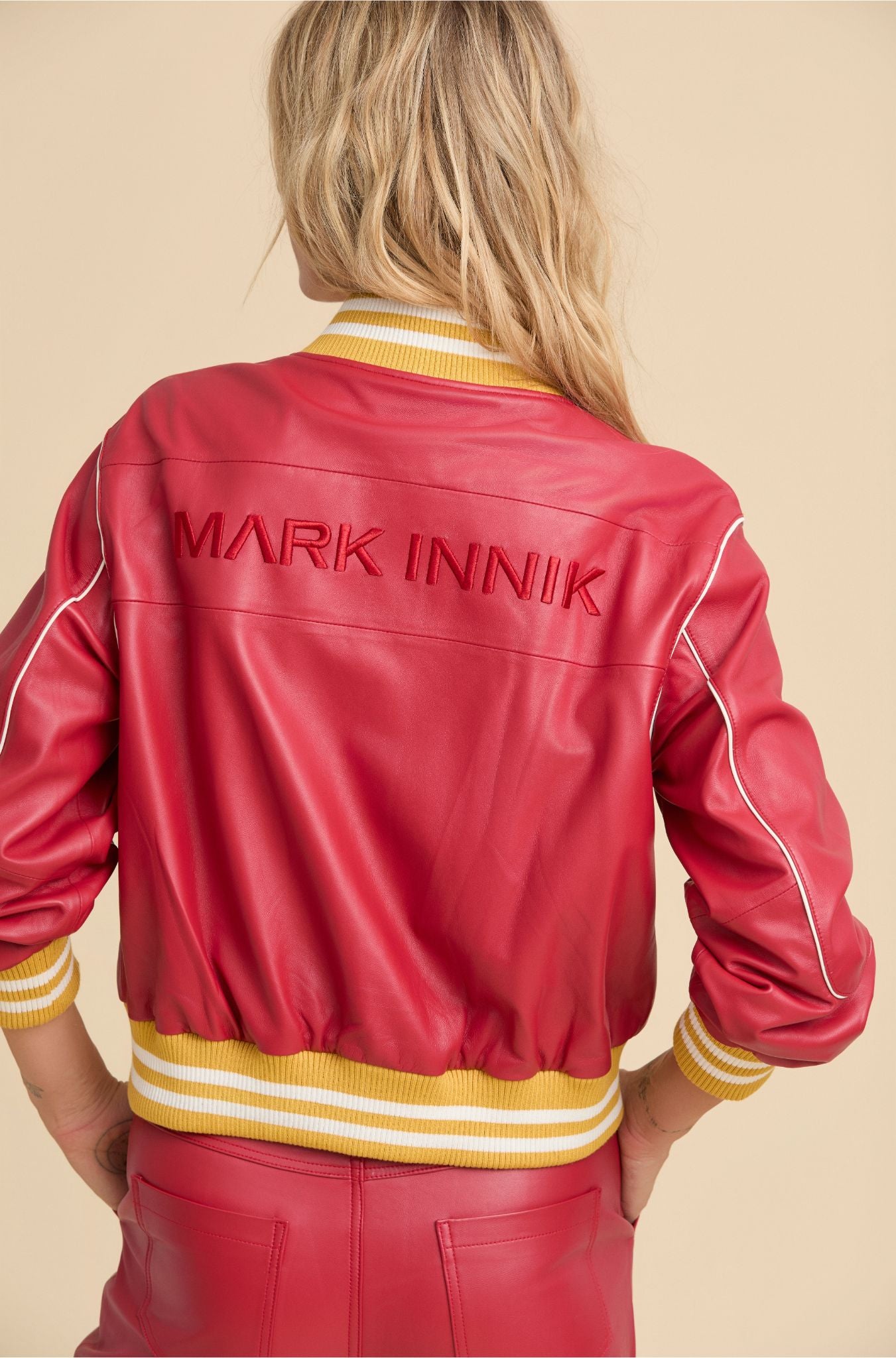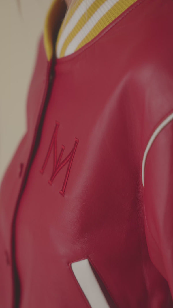 Nuestra bomber Mark, está inspirada en un  estilo universitario único y atemporal , pensada para acompañarte cada día a día, llueva o haga sol. Fabricada en suave piel de cordero y de corte boyfriend se caracteriza por su bordado en delantero y espalda con el logo de nuestra marca y por sus detalles en contraste.