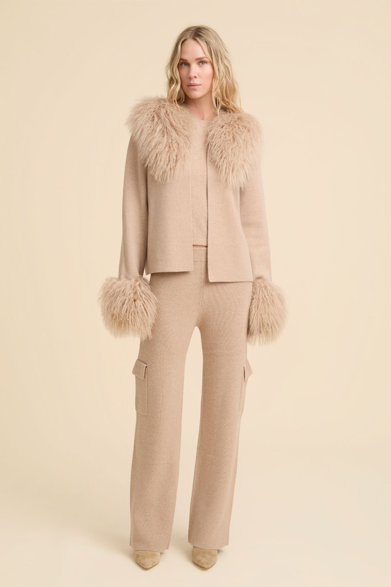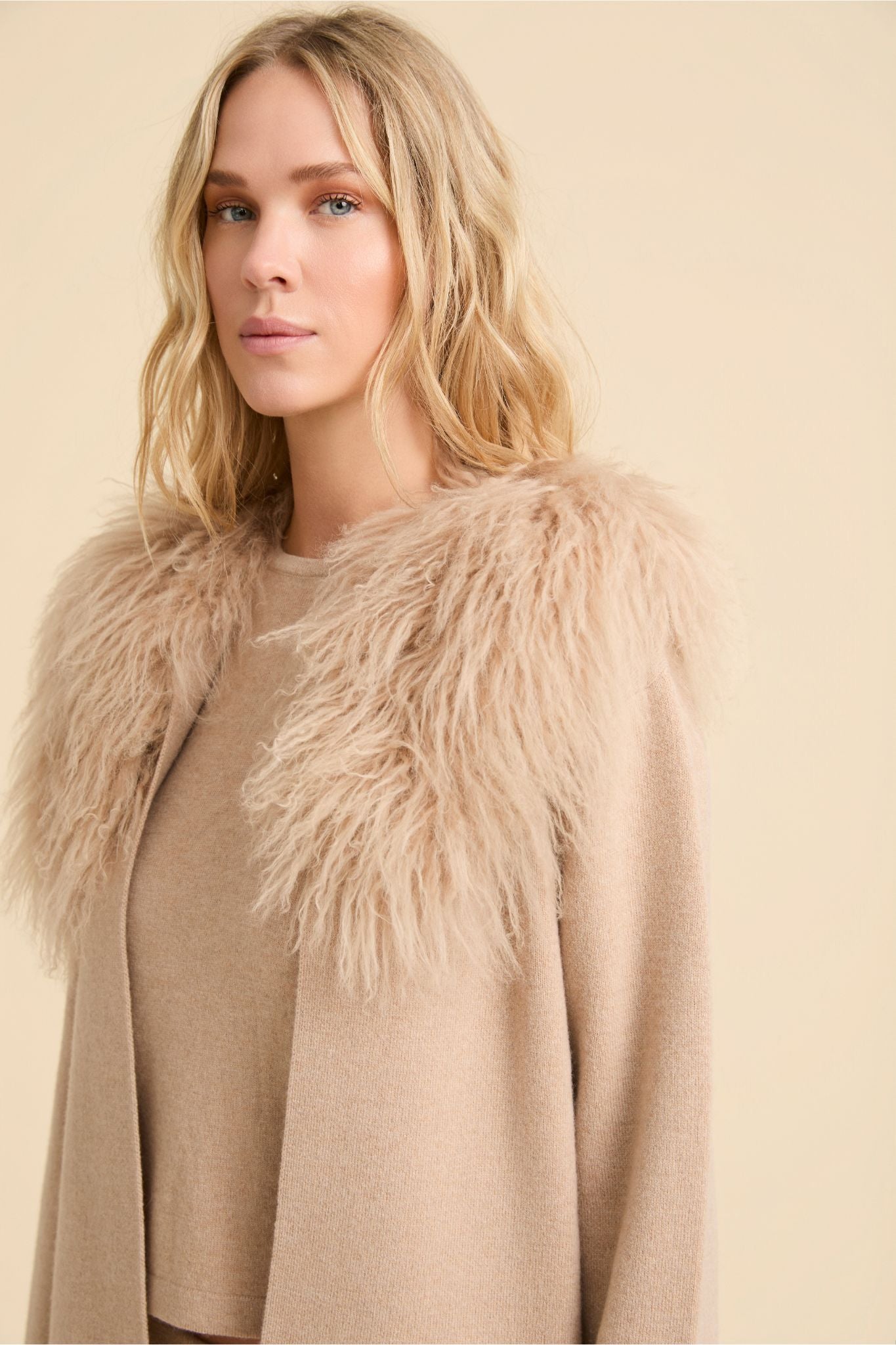 Nuestra chaqueta de punto Olivia cuenta con un cuello y puños de piel de oveja desmontables haciendo de ella que sea tan cómoda como elegante. Su color la hace muy versátil pudiendo llevarla con todo pero te recomendamos que la combines con nuestro jersey Billy y pantalones Clay para crear un look casual y estiloso.