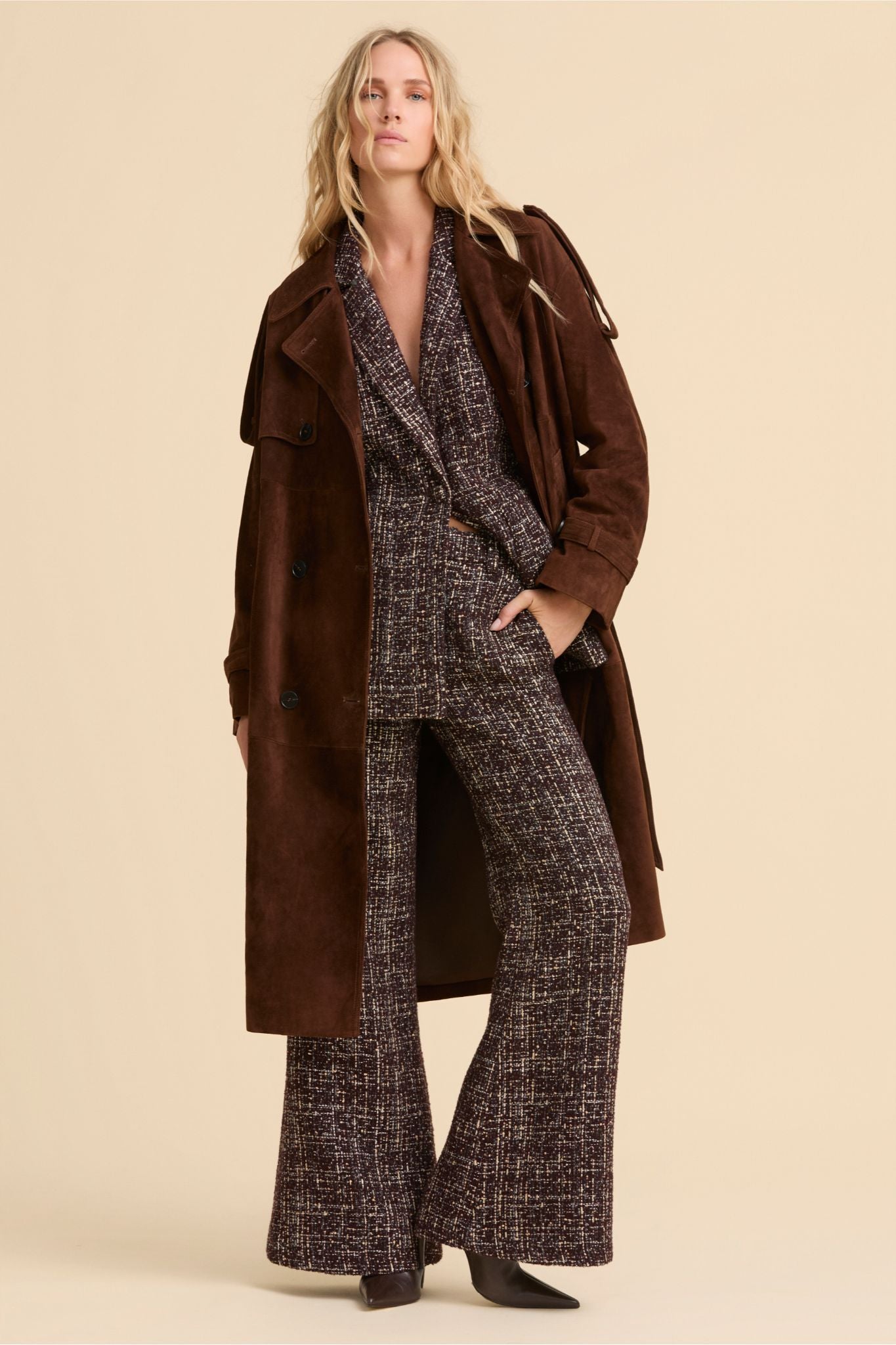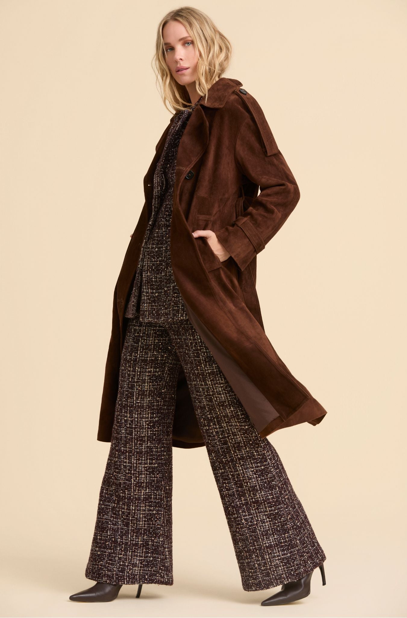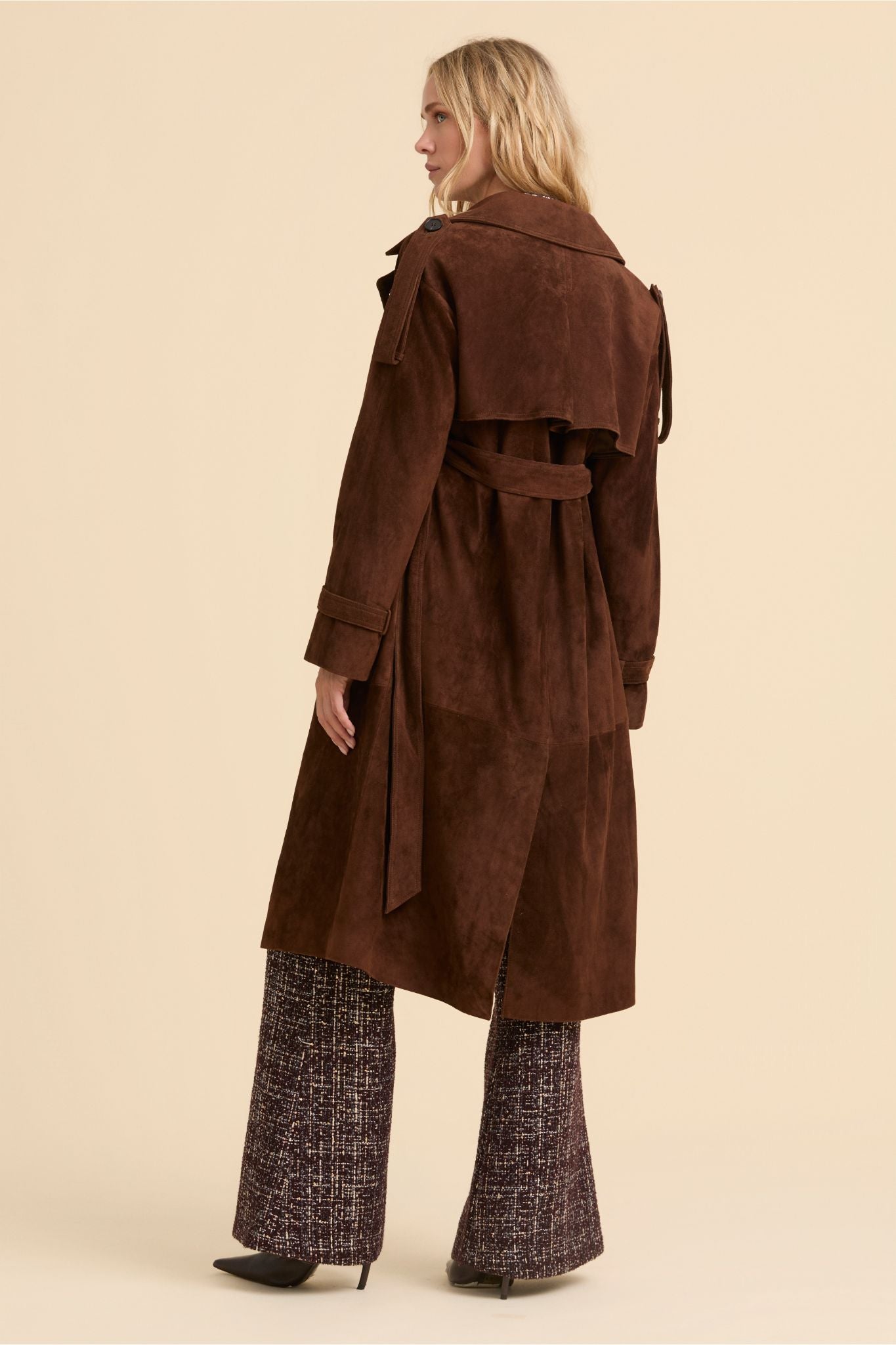 Nuestra gabardina Selena está confeccionada en ante de alta calidad. Diseñada con grandes solapas, doble botonadura y cinturón crea una silueta refinada de elegancia atemporal.