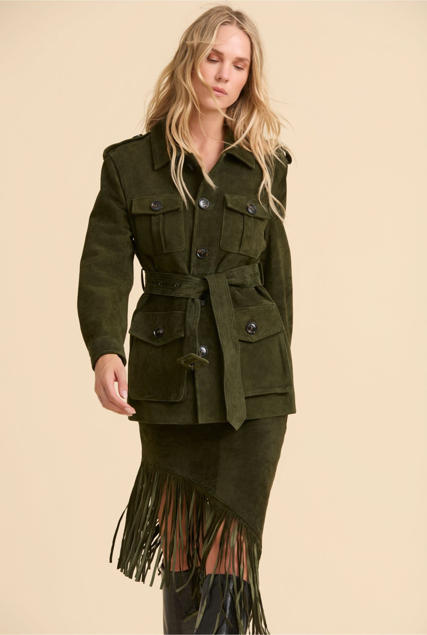 Nuestra falta Texas,con inspiración western,está confeccionada en ante de alta calidad. Los flecos desfilan de forma asimétrica a lo largo de la figura proporcionando movimiento y estilo de forma arrolladora. Combínala con nuestra chaqueta Dallas para un crear un look increíble.