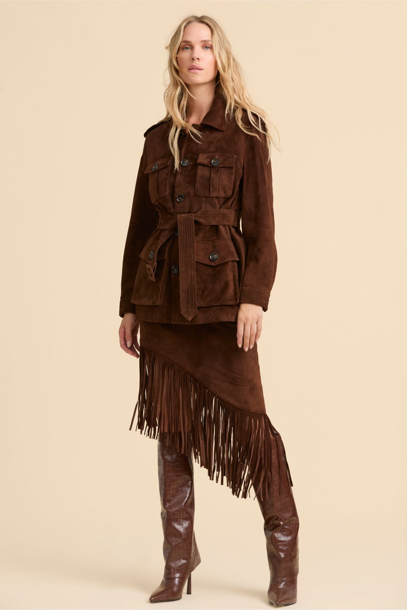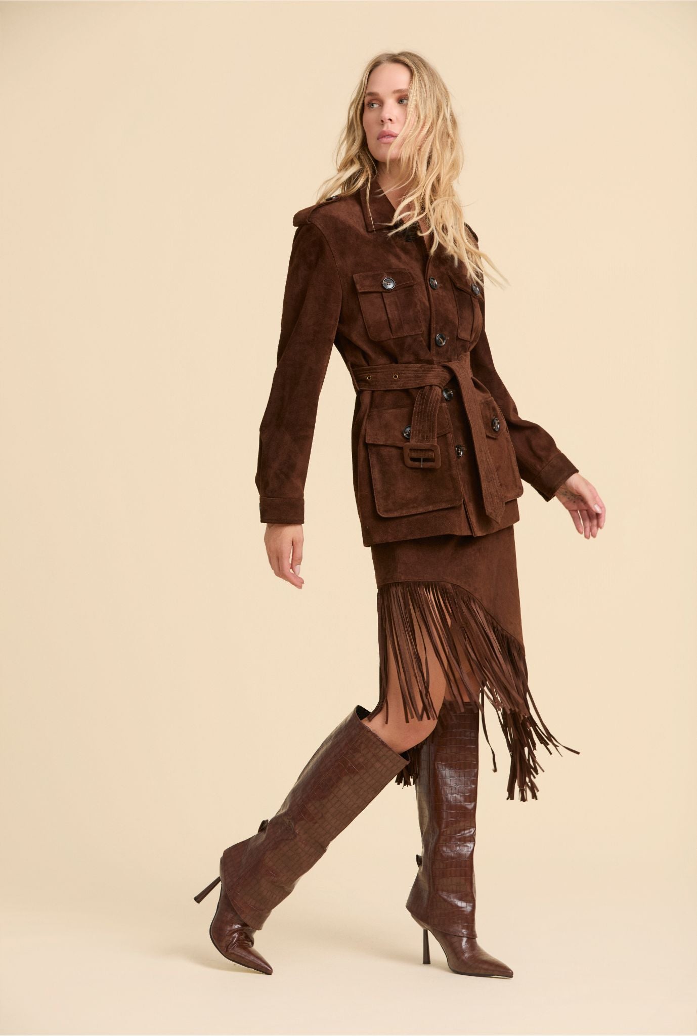 Nuestra falta Texas,con inspiración western,está confeccionada en ante de alta calidad. Los flecos desfilan de forma asimétrica a lo largo de la figura proporcionando movimiento y estilo de forma arrolladora. Combínala con nuestra chaqueta Dallas para un crear un look increíble.