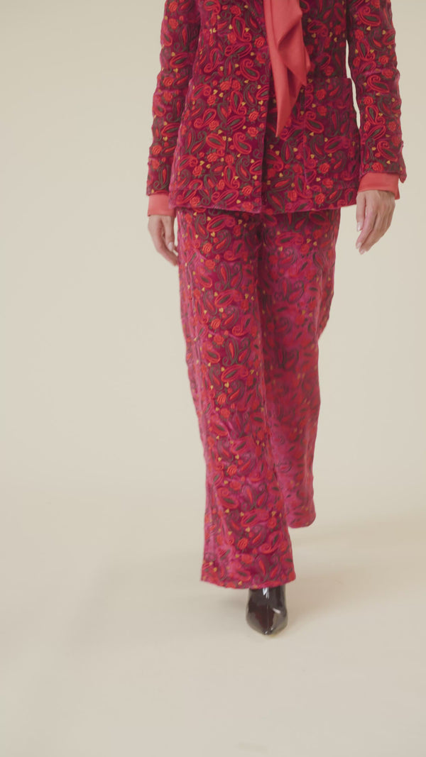 Pantalón confeccionado en terciopelo bordado ligeramente elástico con dibujo Paisley.